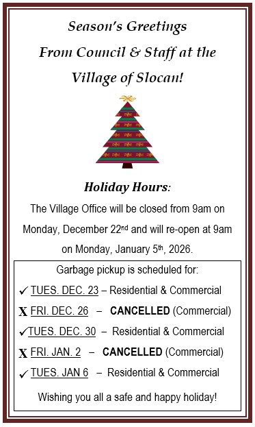 CHRISTMAS HOLIDAY HOURS:THE VILLAGE OFFICE WILL BE CLOSED AT 4:00 p.m. ON MONDAY, DECEMBER 23rd, 2013 AND WILL RE-OPEN AT 9:00 a.m. ON THURSDAY, JANUARY 2nd, 2014. RESIDENTIAL GARBAGE WILL BE PICKED UP ON: COMMERCIAL GARBAGE WILL BE PICKED UP ON: BUILDING INSPECTION SERVICES WILL BE AVAILABLE ALL THURSDAYS IN DECEMBER (11am – 12pm) EXCLUDING THE 26th. |