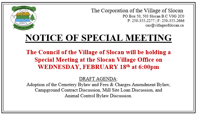 | Feb. 20, 2014 | NOTICE: RDCK PUBLIC MEETING Residents of the Village of Slocan and Electoral Area H are invited to attend a public meeting to discuss the RDCK 2014 Budget. Thursday, February 20, 2014 at 1:30 pm Slocan Village Office, Council Chambers. |