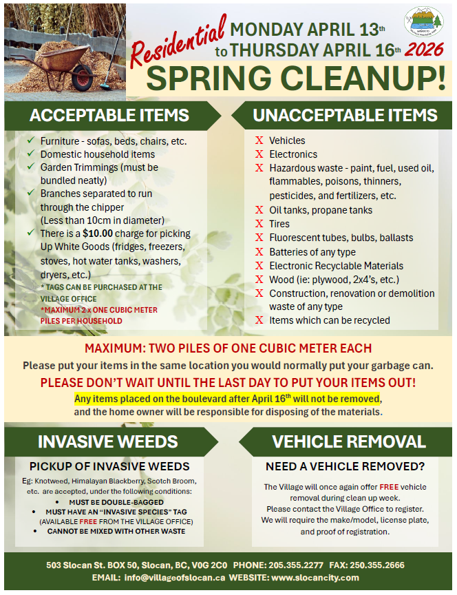 | April 2012 | The Village of Slocan has two vehicles available for bid. Bidding Closes June 15th, 2012 at 4:00 p.m. | For Sale |