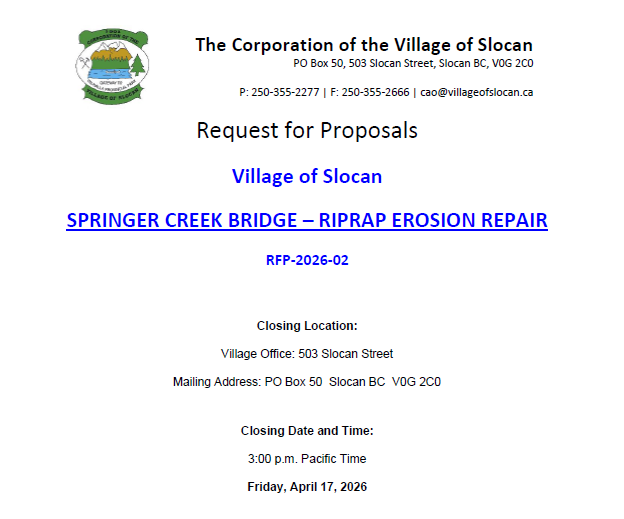 | June 19, 2013 | REQUEST FOR PROPOSALS: JANITORIAL SERVICES The Village of Slocan invites proposals for Janitorial Services for the Village Office and the Health and Wellness Center. Proposals will be excepted no later than 2pm on Monday, July 31, 2013. Proposals may be faxed, mailed or emailed. JANITORIAL AD TERMS OF REFERENCE |